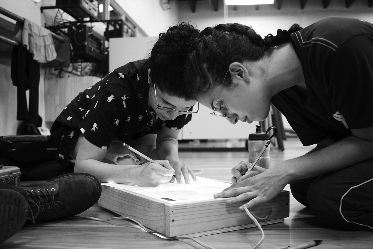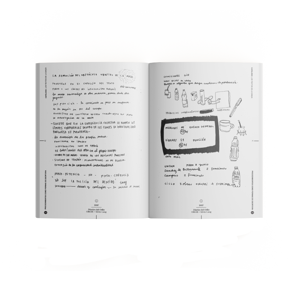 El diseño gráfico de los ejemplares refleja los procedimientos analógicos que realizamos en residencia cada vez que editamos un nuevo ejemplar: hacemos uso de una sala de danza, la recorremos, a través de técnicas de montaje low tech vestimos sus paredes con documentos impresos en blanco y negro. Ponemos el cuerpo en relación a los archivos, los subrayamos, los recortamos, descartamos partes, hacemos bollos, pegamos trozos en el piso, delimitamos territorios por temática, generamos relaciones entre las obras. De esta manera los textos que conforman cada proceso de creación se entremezclan, conviven, dialogan, adoptan una geografía ecléctica con particulares relieves, gestos, imágenes que se escapan de los bordes. Todas las piezas catalogadas forman parte de un conjunto, de un sistema, una escena, una comunidad, un modo de hacer, un contexto y un tiempo histórico.