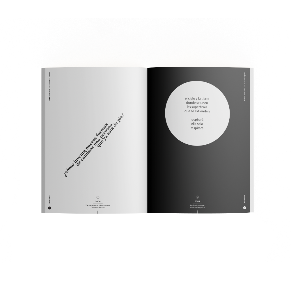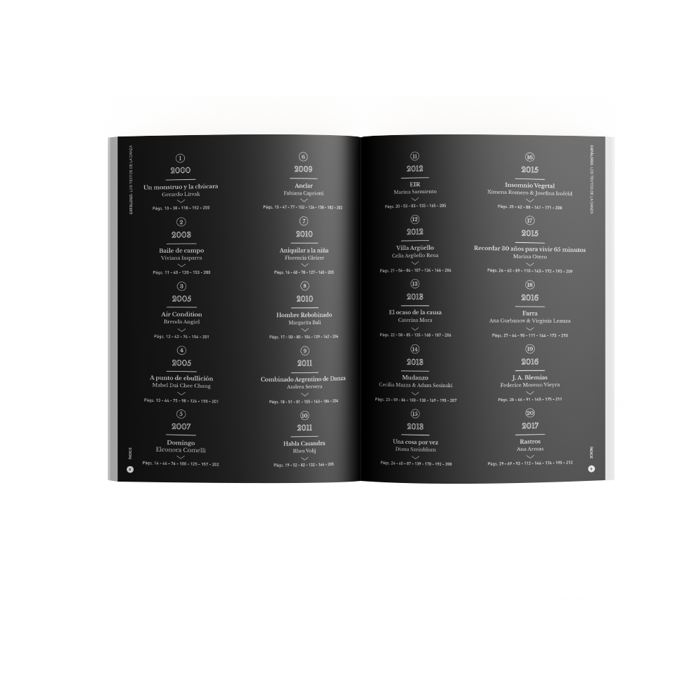 Esta colección de catálogos es un proyecto editorial que realizamos en coautoría con Josefina Zuain hace más de diez años y que pone en relación sus investigaciones como historiadora del arte con mi práctica como diseñadora gráfica. Cada libro hace visible la diversidad de escrituras que conforman los procesos de creación en danza tanto a nivel nacional como internacional, desde el 2000 hasta la actualidad.