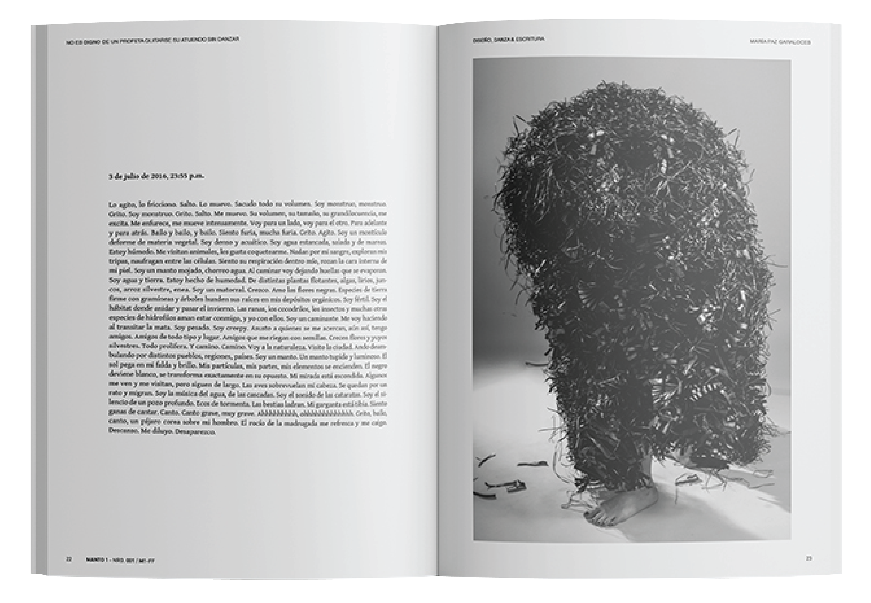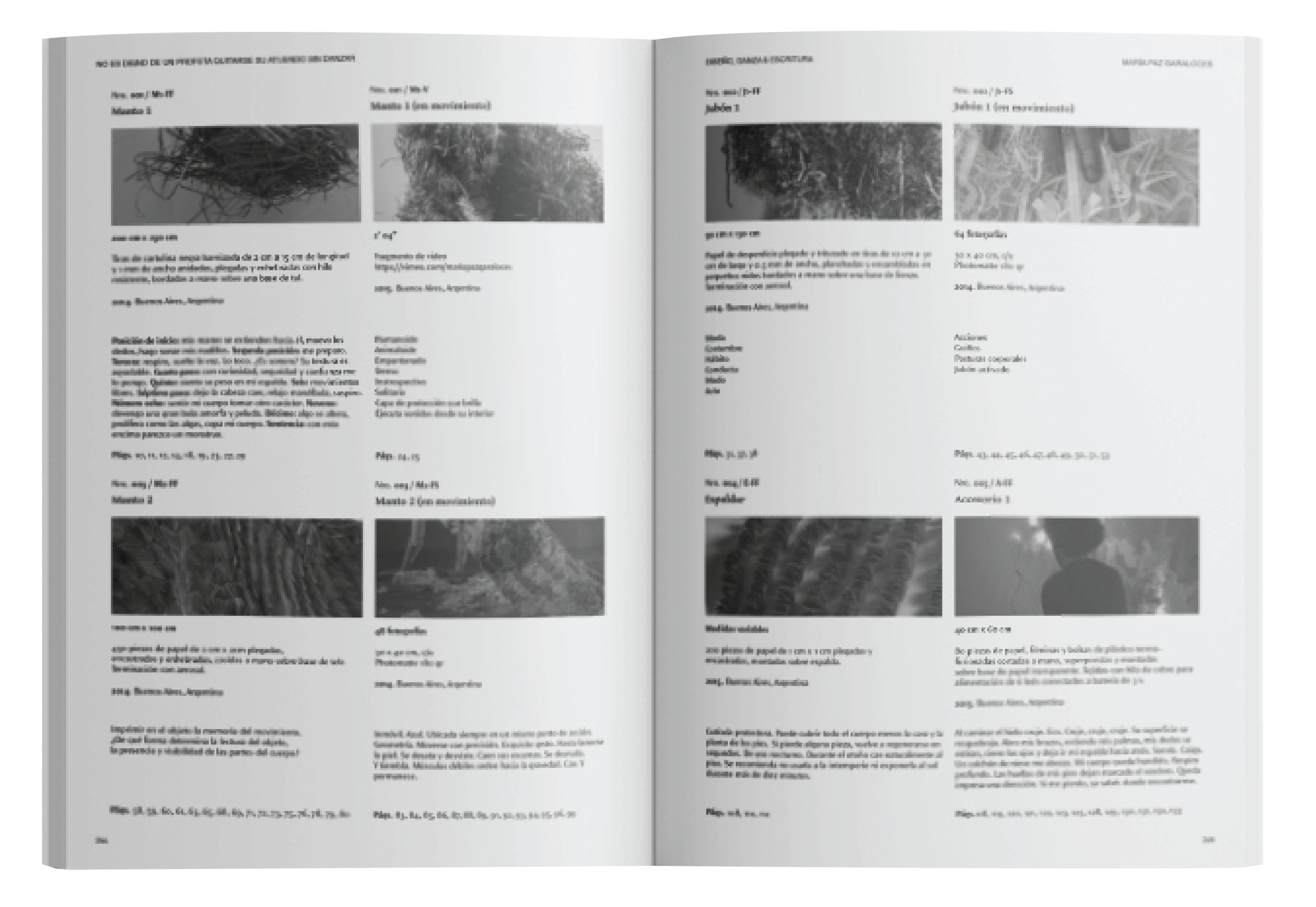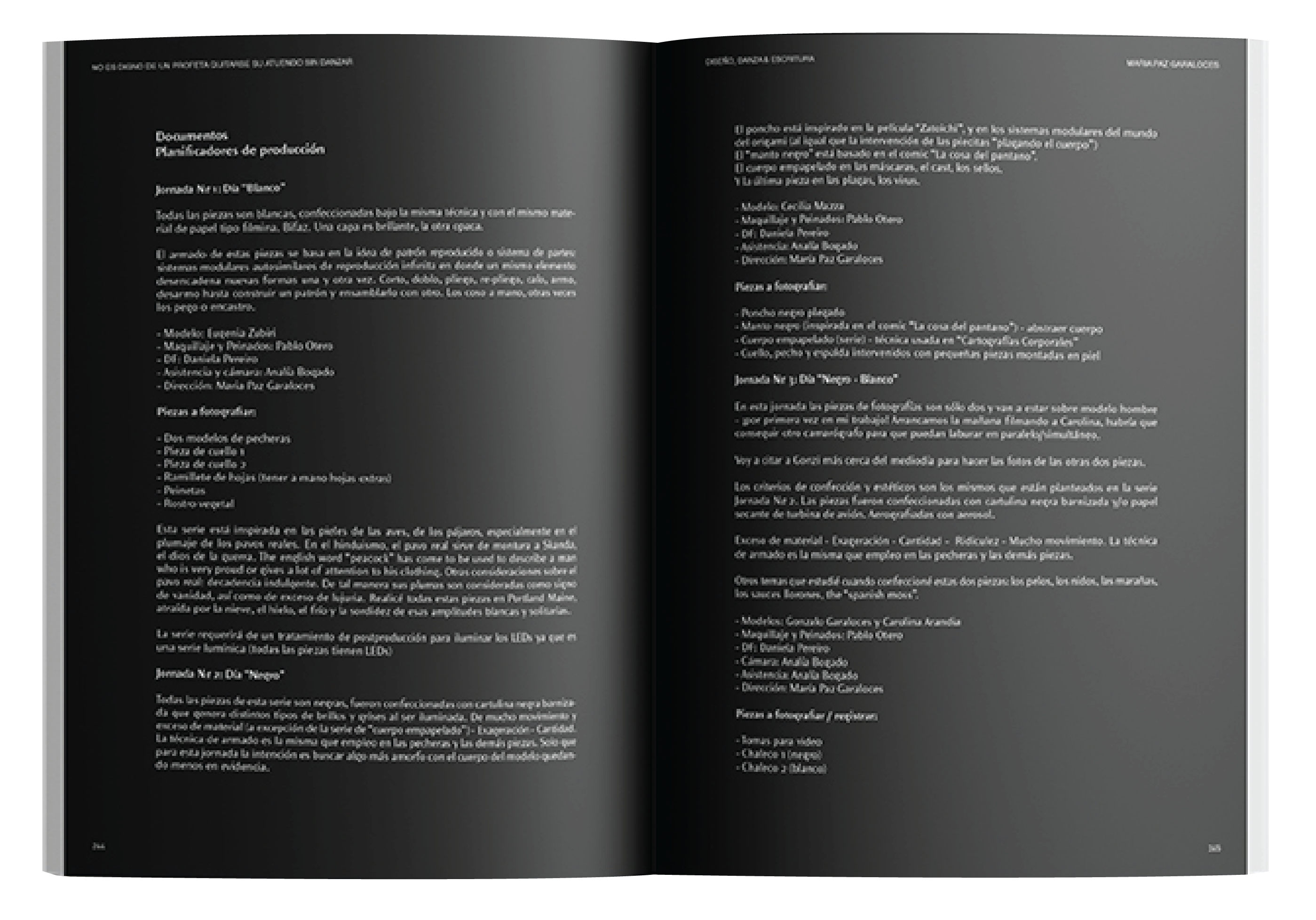 Este libro es un diario, un catálogo, una colección de atuendos y también un retrato de mi obra-vida-trabajo como diseñadora que reúne una investigación de quince años de práctica artística alrededor de la confección de piezas y trajes con papel, el estudio de ciertos patrones presentes en la naturaleza, la danza, el movimiento, la fotografía documental, la escritura, la creación escénica y la labor colectiva.